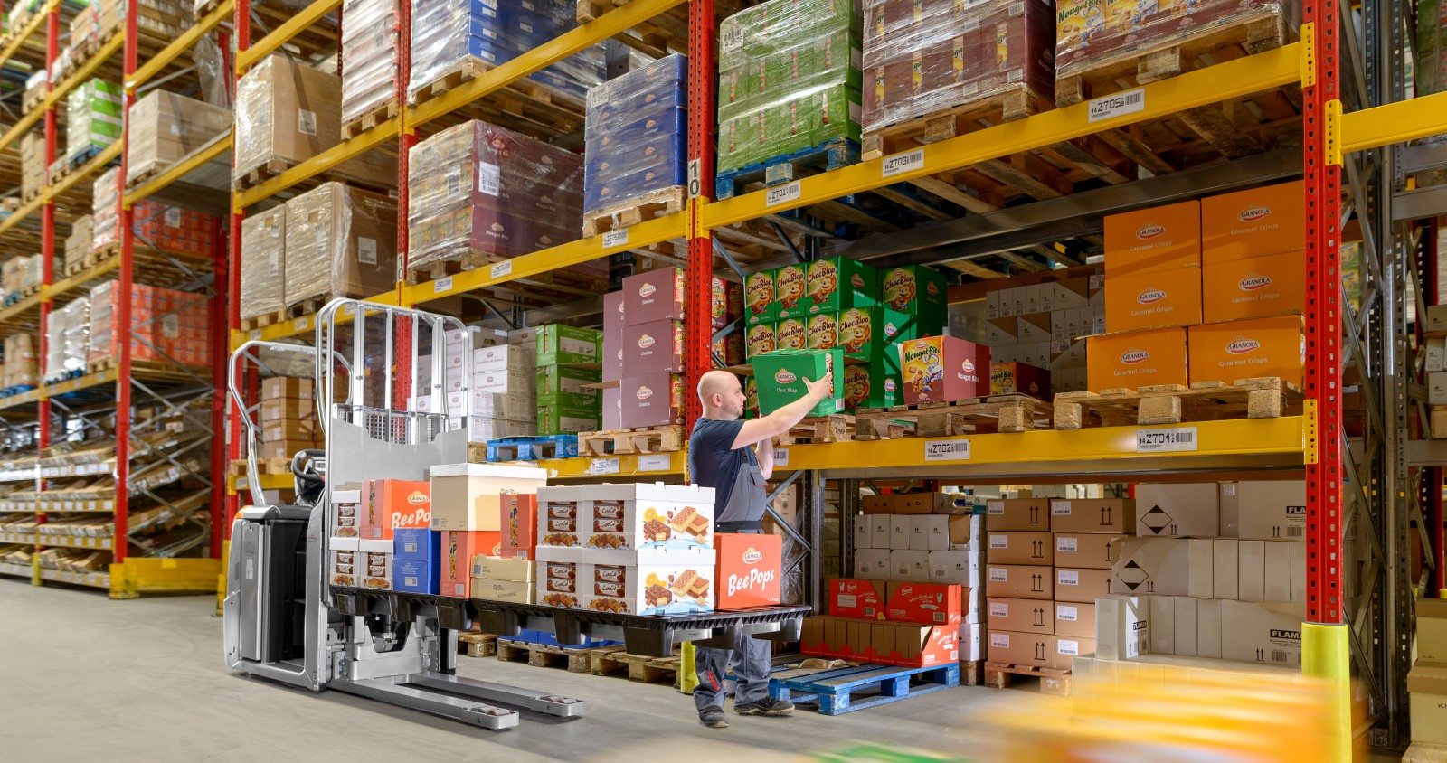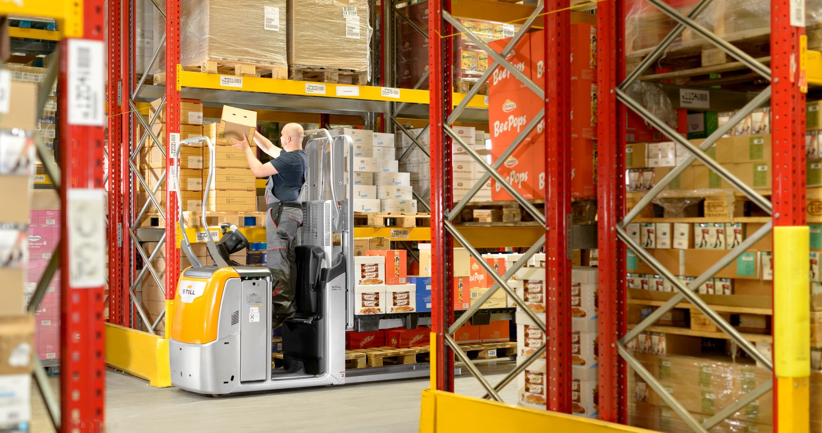 Katlanabilir basamak ve yükseltilebilir operatör platformu ile birinci raf seviyesinde hızlı sipariş toplama